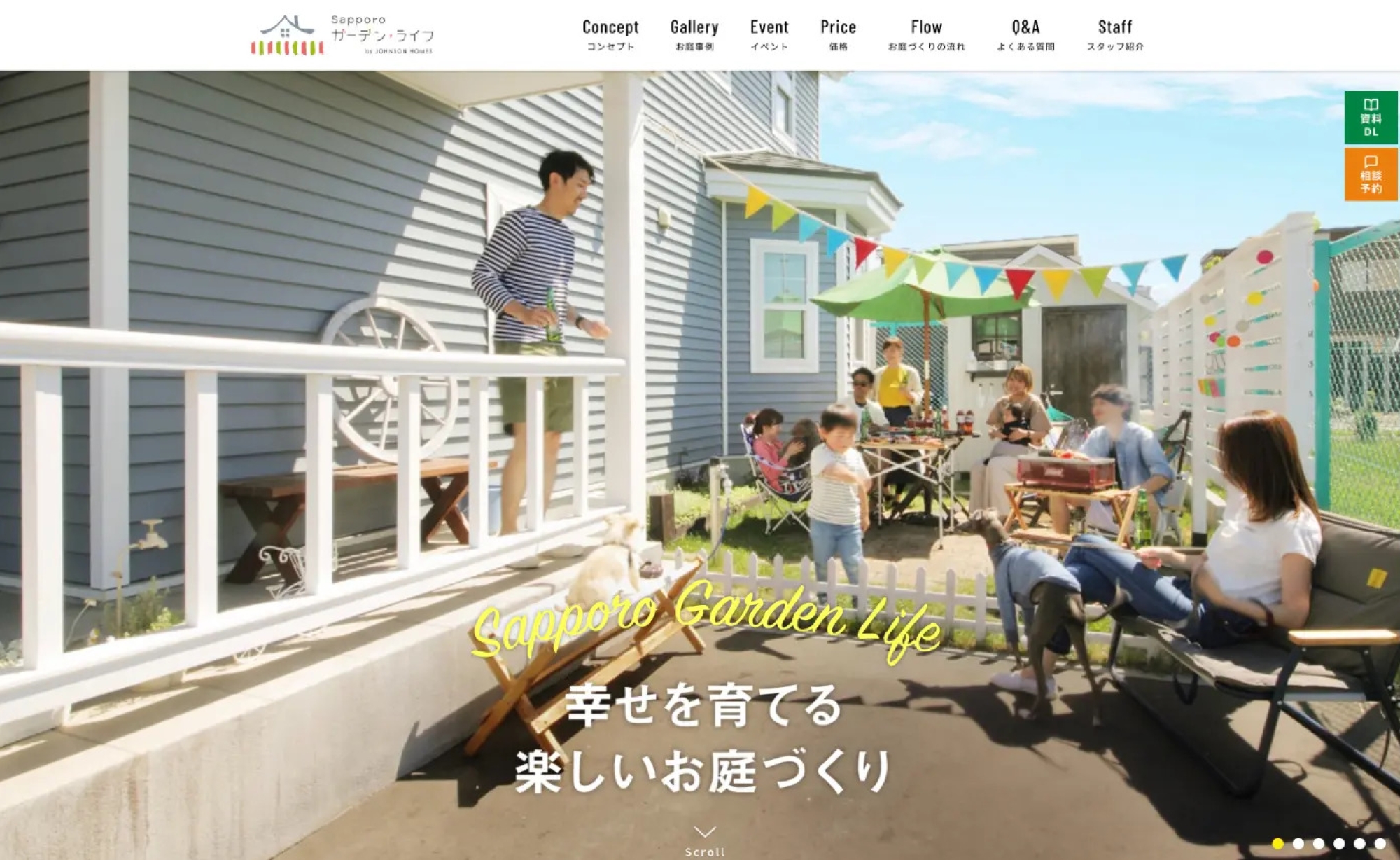 約3,500棟の施工実績を誇る住宅メーカージョンソンホームズが運営する、お庭づくりや外構を提案するさっぽろガーデンライフ。住宅会社にしかできない提案力を持っており、お客様の暮らしに合わせた提案はもちろん、住まいに合った外構づくりを目指しています。また一貫したサポート体制やアフターフォローを万全にし、お客様に寄り添った外構づくりを進めていきます。