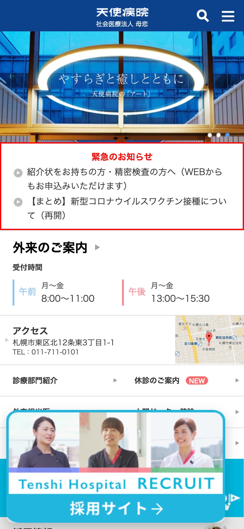 病棟拡大を機に、ウェブサイトをフルリニューアル。メインターゲットである患者、医療関係者、リクルートの3つに大きく分類し、対応するコンテンツをまとめたサイトを設計しています。総合病院のため、診療科数が豊富です。多くなっても探しやすいよう、アイキャッチとなるアイコンで表現することで、目的の科を探しやすくしました。