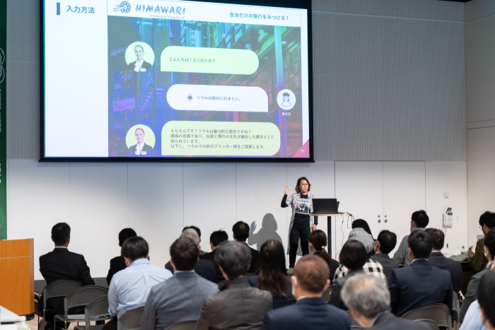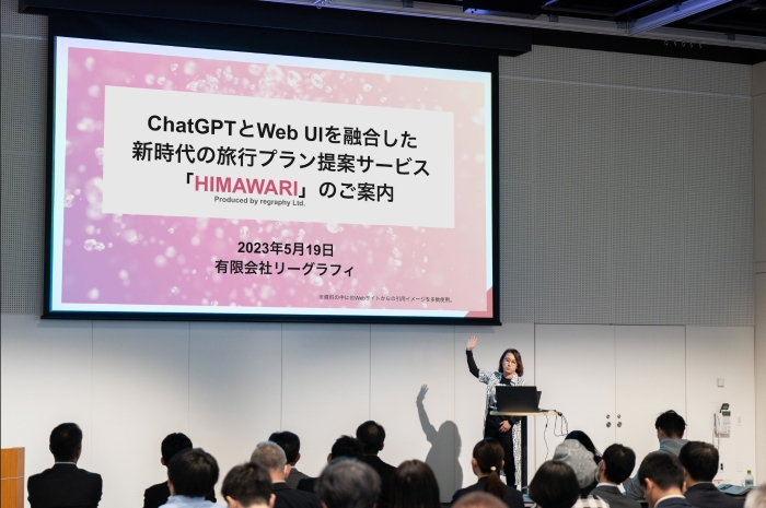 リーグラフィは事業紹介以外に、スタートアッププロジェクトのモデル「ChatGPTとWeb UIを融合した新世代の旅行プラン提案サービス」を中心に話しました。