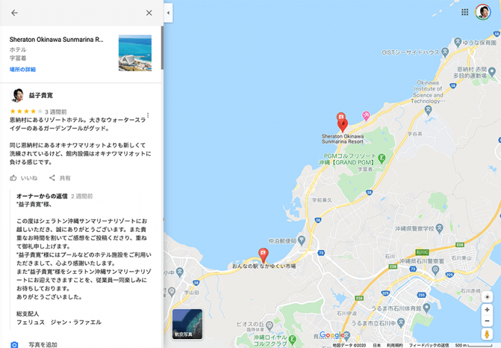 Google マップ上のクチコミに対して、その企業や店舗の運営者から返信できます(オーナー登録が済んでいない場合は、済ませておきましょう)。クチコミの中身としてはTwitterに近く、よい点も悪い点も率直に書かれるので、問題解決の機会が多く得られるはずです。