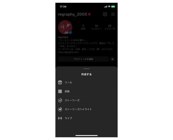 画面上の作成ボタン(+記号)を押すと、さまざまな投稿タイプが表示される