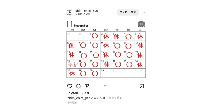 営業日・定休日・臨時休業日などをきちんと伝えることも大切です。プロフィールに書いておいてもよいのですが、月によってイレギュラーな休業日が発生する場合は、カレンダー形式の画像で伝えるとよいでしょう(Instagramで「営業日カレンダー」と検索すると、参考になる画像が見られます)。