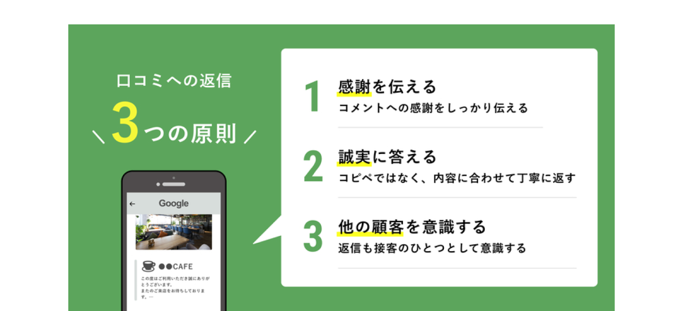 - 口コミ返信の基本は「感謝・誠実・他の顧客を意識する」の3原則