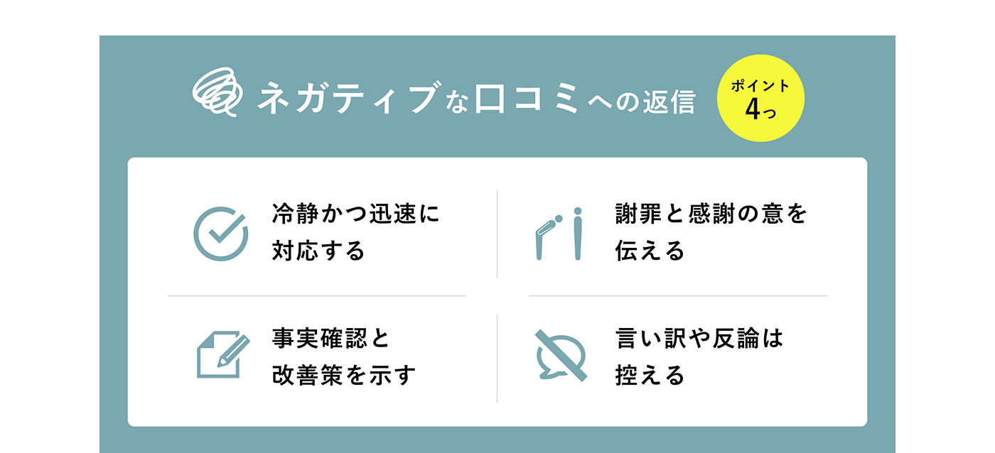 - 誹謗中傷など悪質な口コミには、冷静に適切な手段で対応を