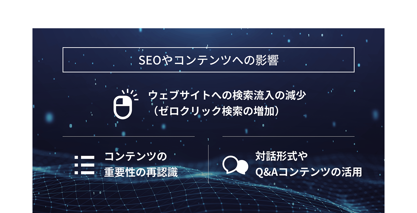 AI Overviewによってユーザーの検索体験が高まると同時に、ウェブサイトの運営者としては検索流入の減少(ゼロクリック検索の増加)やコンテンツ制作面での変化に対応することが求められます。