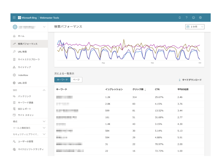 左メニューの「検索パフォーマンス」を開くと、キーワードやページごとに、Bingでのインプレッション(表示回数)、クリック数、CTR(クリック率)、平均の位置(順位)を確認できます。