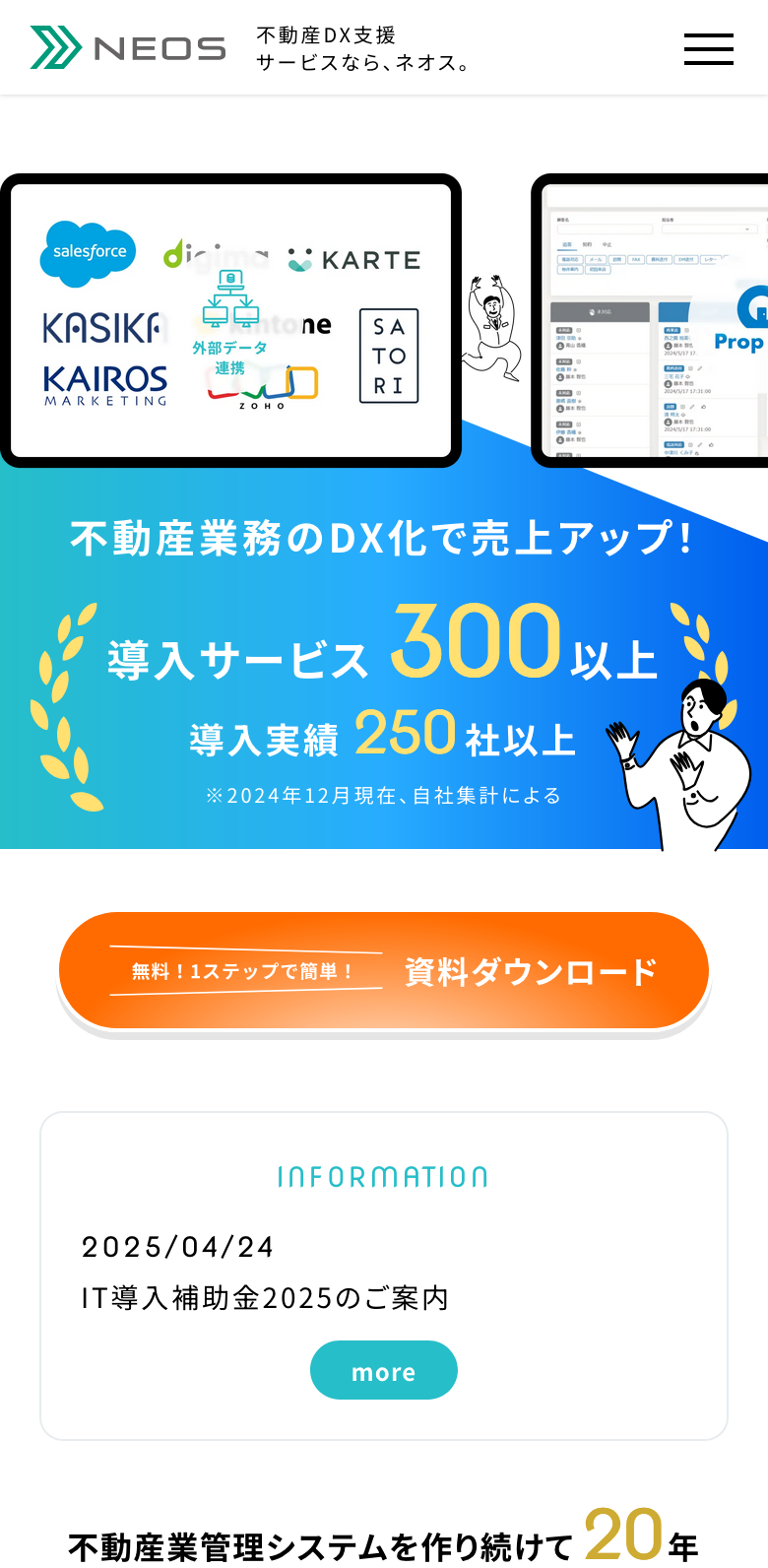 不動産管理におけるさまざまな課題に対し、システム開発・クラウドサービス・DX運用支援を通じて解決を図る株式会社ネオス様の「不動産業務DX支援サービス」のWebサイト制作をお手伝いさせていただきました。