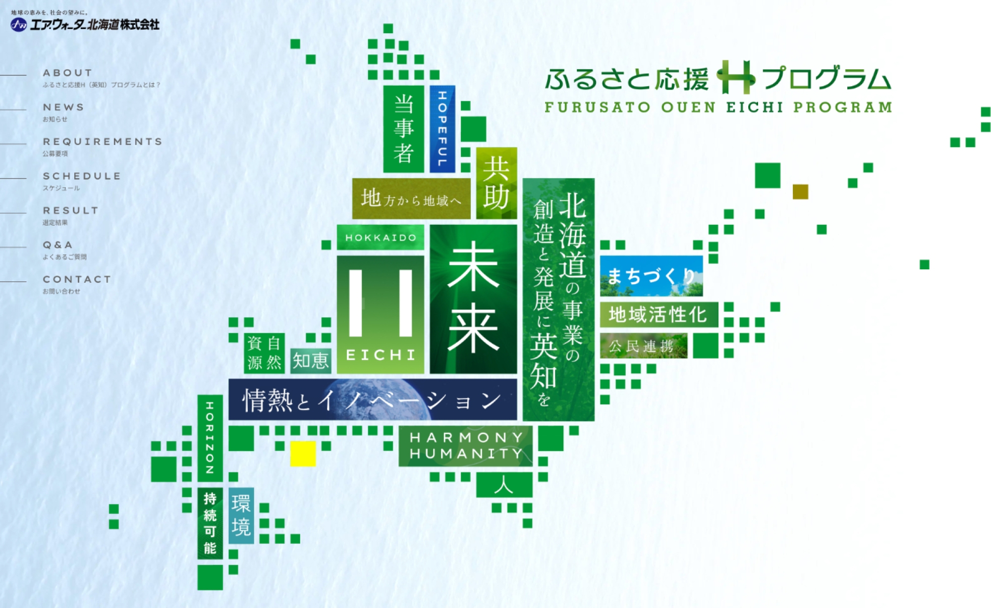 エア・ウォーター北海道株式会社の「ふるさと応援Hプログラム」のウェブサイトを制作しました。このプロジェクトは、北海道から世界に向けた社会課題の解決、地域の活性化に向けた道内全179市町村を対象にした、寄付支援制度です。