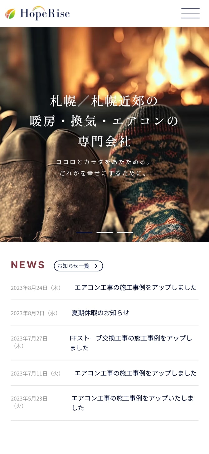 札幌/札幌近郊の暖房・換気・エアコンの専門会社「ホープライズ様」のウェブサイトをデザイン・構築いたしました。施工事例やお知らせはヘッドレスCMSを採用し、サーバーの負荷を軽減しつつも、更新しやすい運営環境づくりを実現しました。