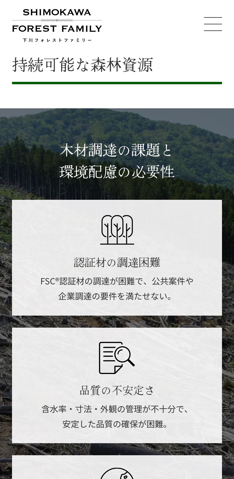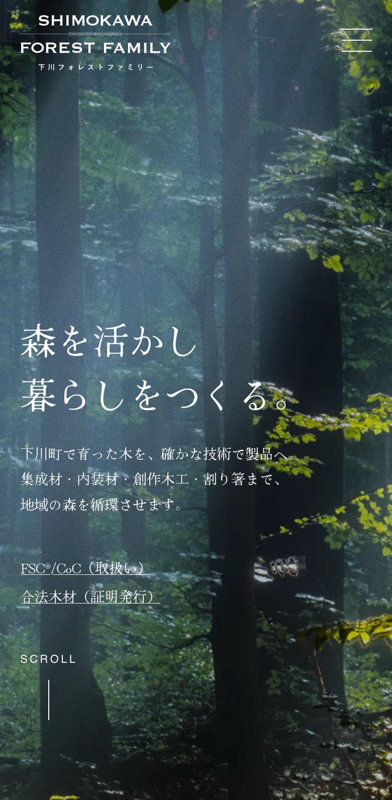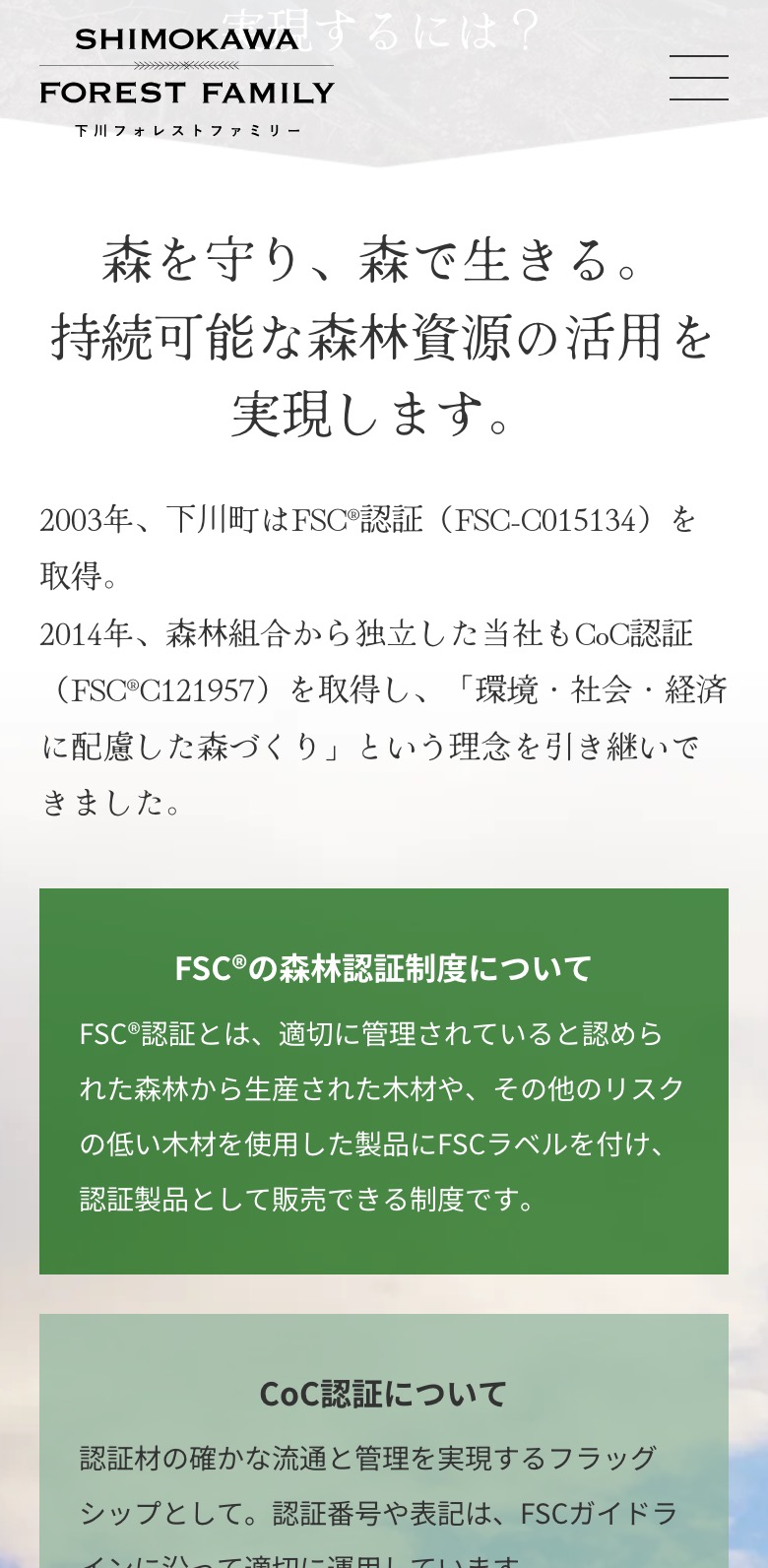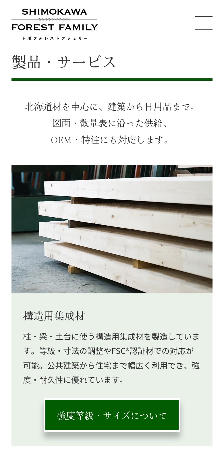 写真を多用し下川フォレストファミリーの工場・現場の空気感を伝えるために撮影も実施しました。企業のリアルな姿が感じられるサイトを目指しました。また、企業理念や地域との関わりを丁寧に言語化し、共感を生む情報発信を重視しました。
