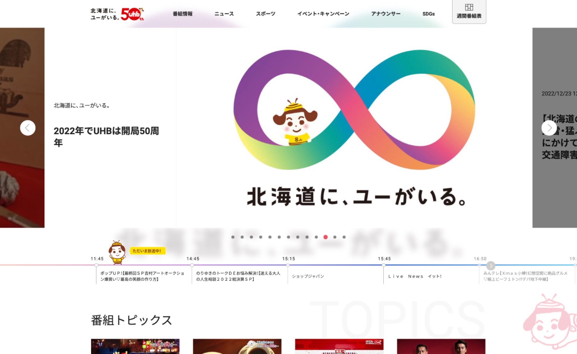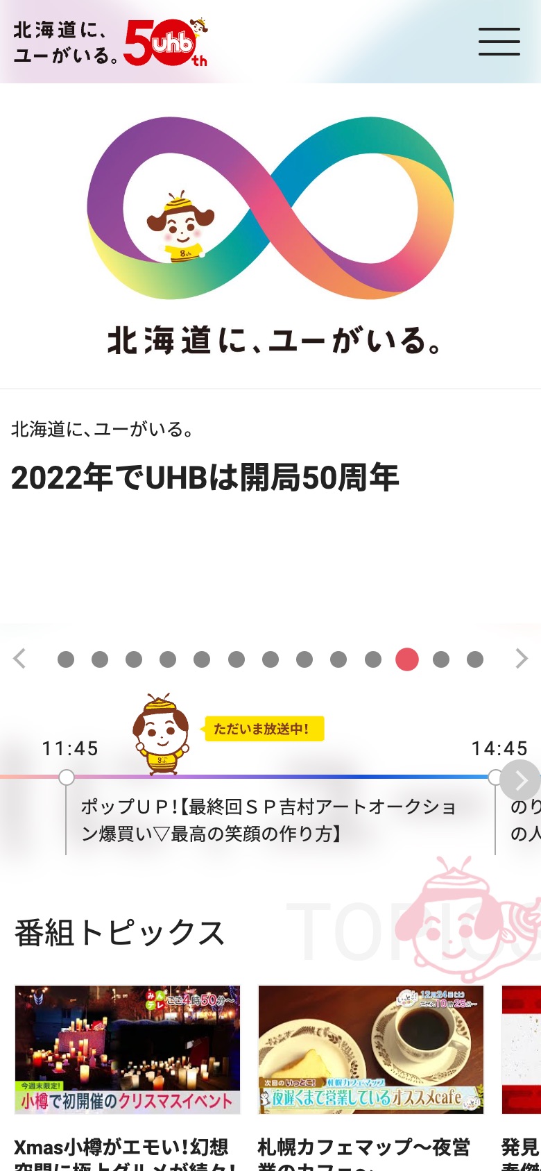 2022年に開局50周年を迎えた、北海道のテレビ放送局UHB。すべては北海道のために、北海道の今をつなぎ、明日を変え、未来を創ることを目標に掲げています。主な番組は、北海道の今が分かる「みんテレ」、トレンドがつまった「いっとこ!」、地域の魅力・人の魅力に迫る「発見!タカトシランド」。北海道の今をつなぎ、地域をつないでいます。