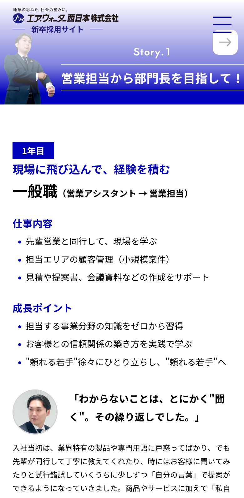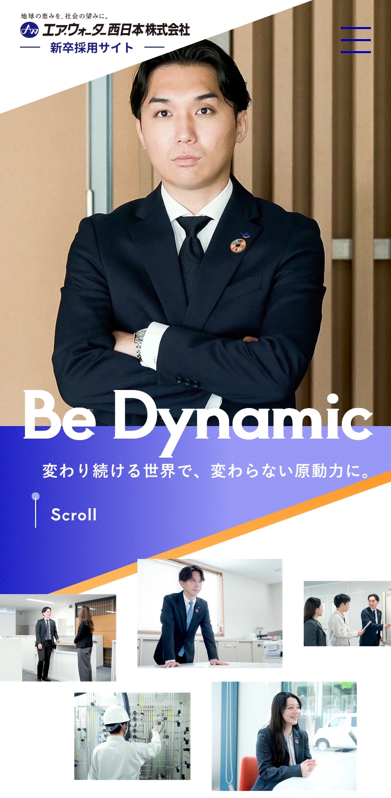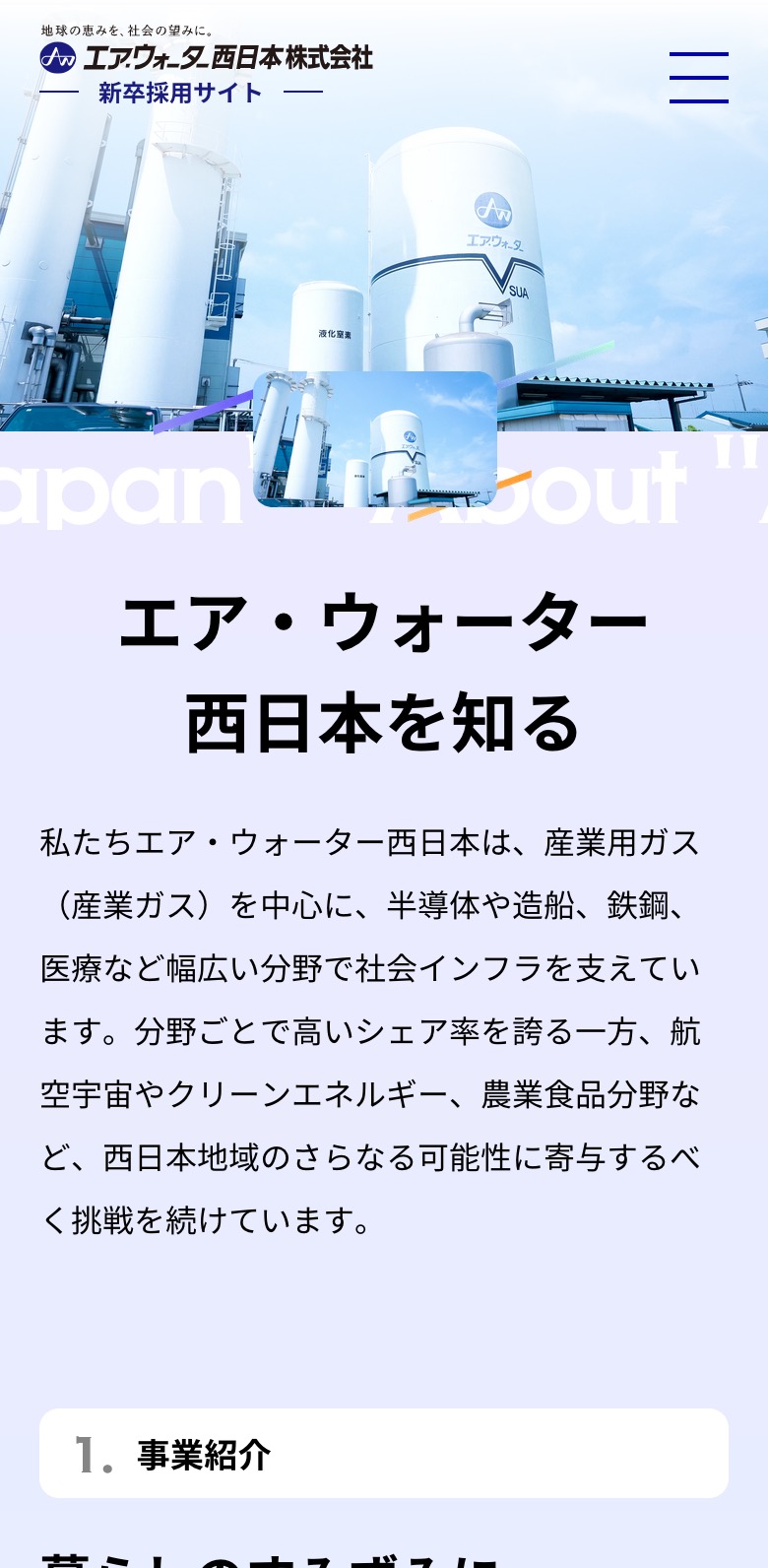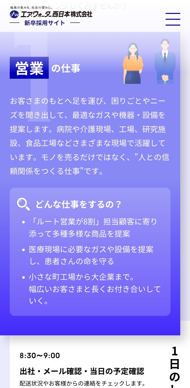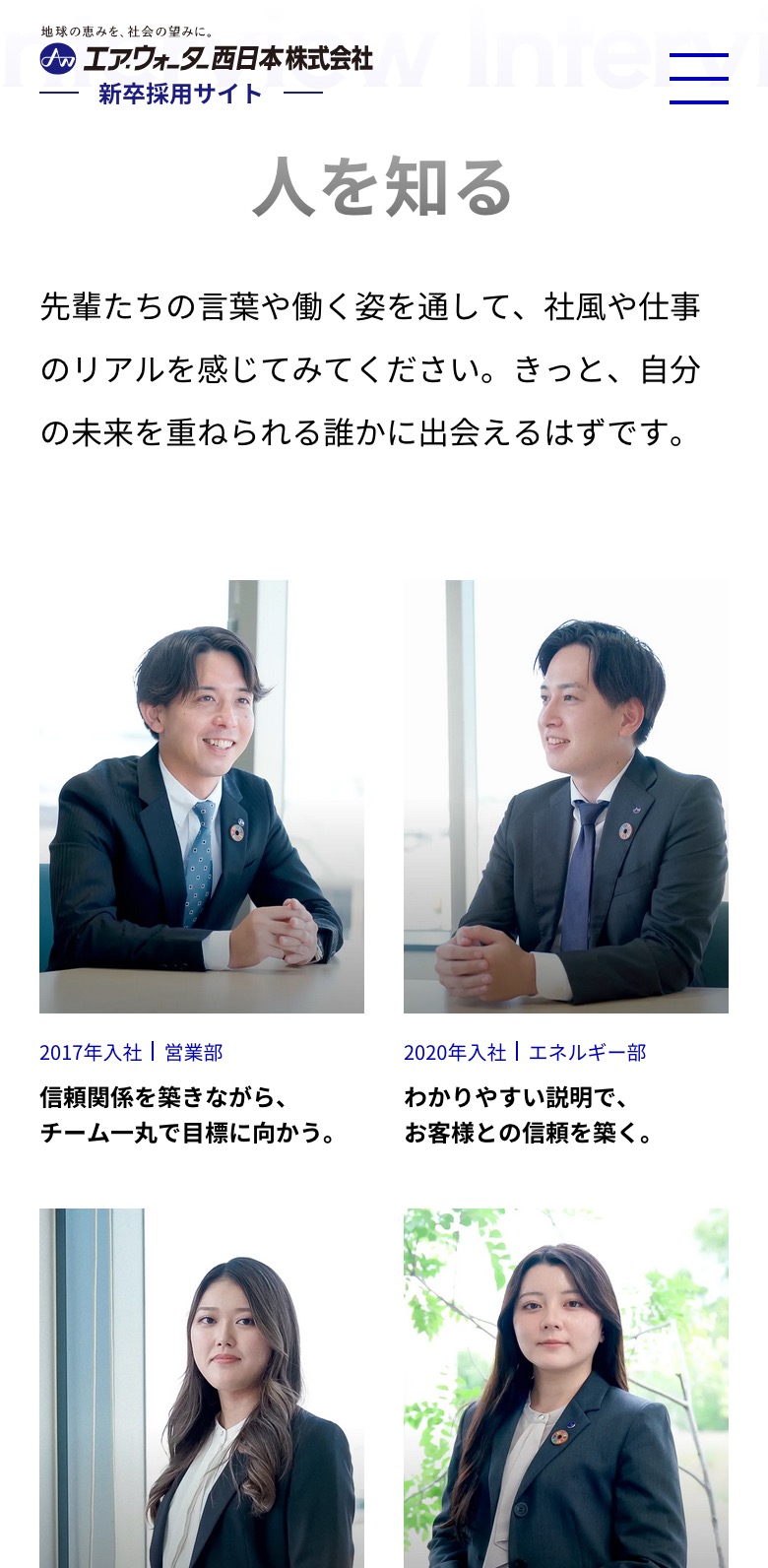 新卒学生に向けて、企業理解と仕事の魅力を直感的に伝える採用サイトとして制作。生活の基盤を支える事業内容は、人々の暮らしにとって不可欠です。そんな事業を支えるために、エア・ウォーター西日本様はタフで活力ある、ダイナミックな思考の持ち主を求めていました。コンテンツとしては「人」「仕事」「成長環境」「職場環境」それぞれにフォーカスし、学生に伝わりやすい情報設計を行いました。社員インタビューや働くシーンを通して、入社後のイメージを具体化。堅実な企業イメージを保ちつつ、若年層にも親しみやすいデザインと導線を意識し、エントリーまでの心理的ハードルを下げる構成としています。