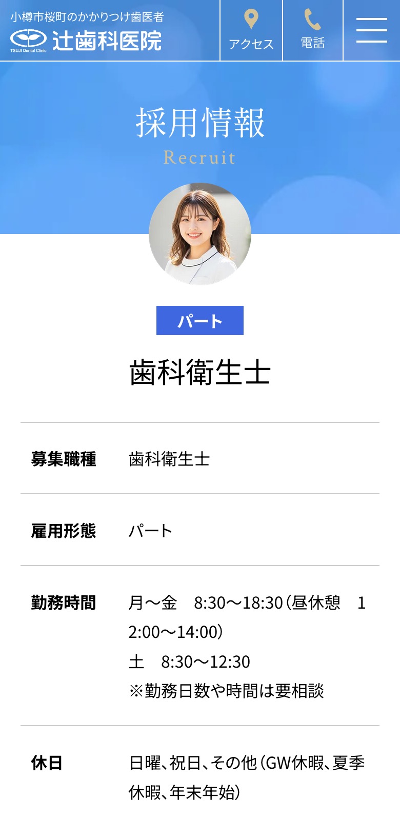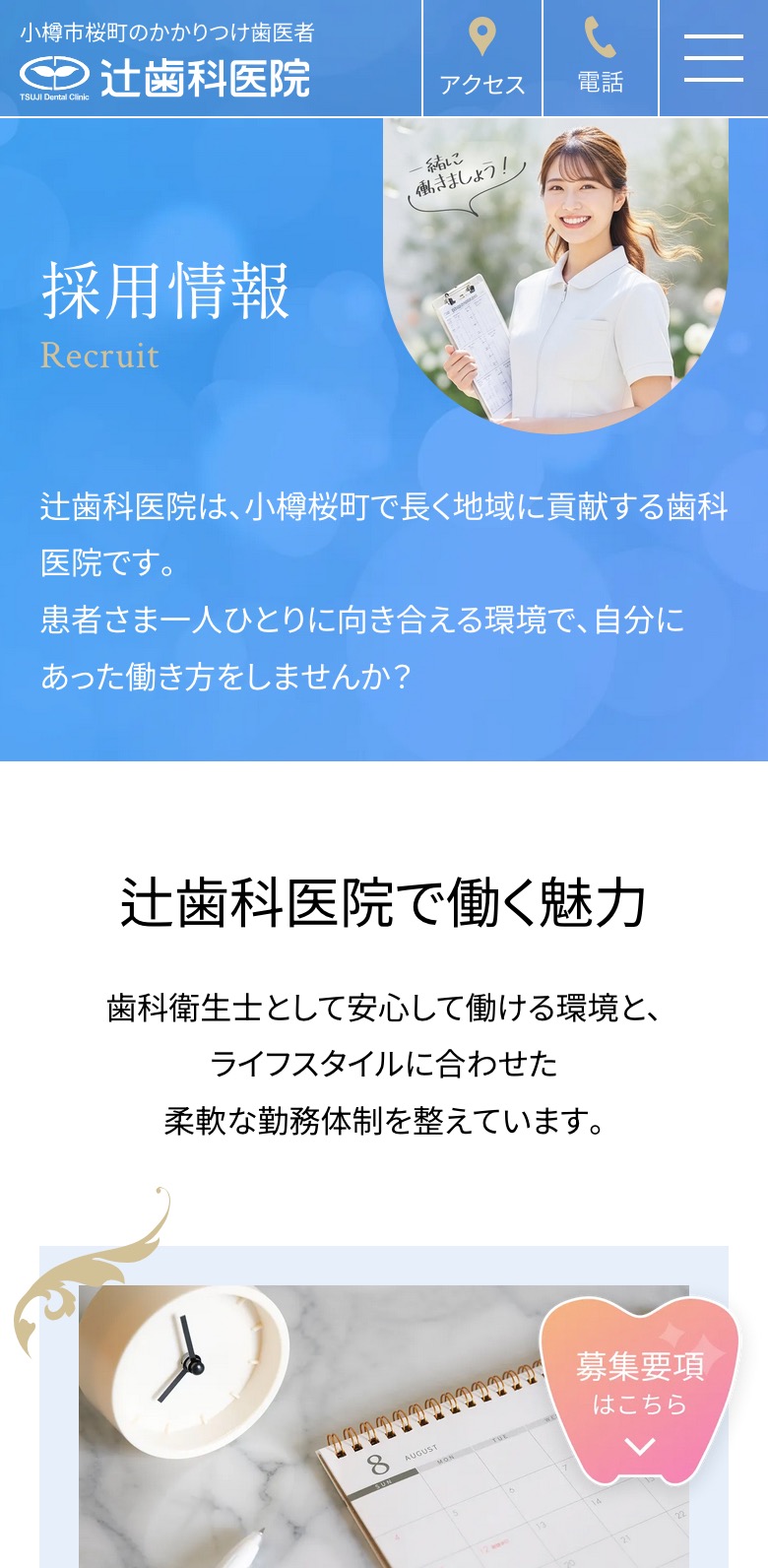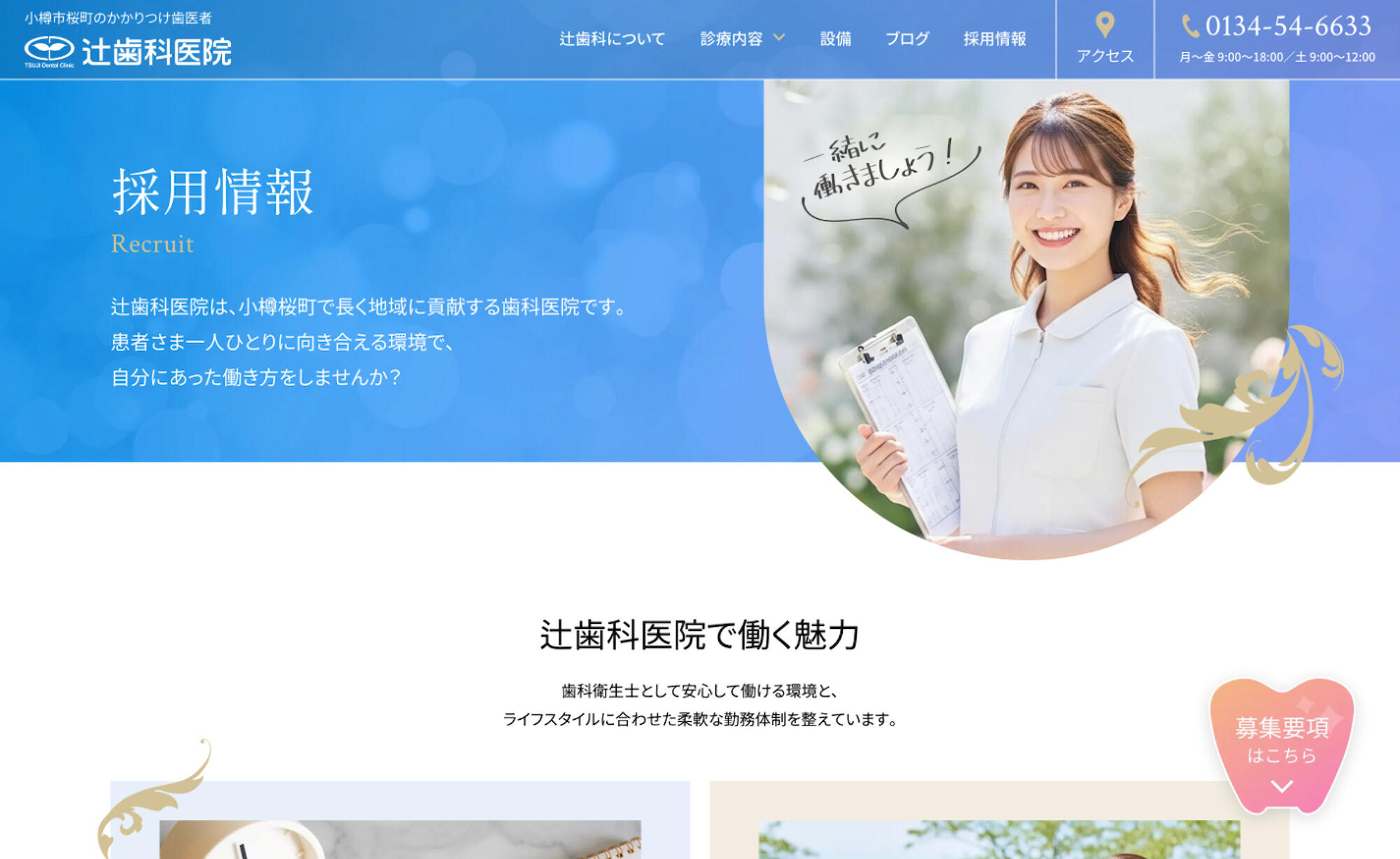 小樽市桜町の「辻歯科医院」の歯科衛生士採用の強化を目的とした採用サイトを制作しました。